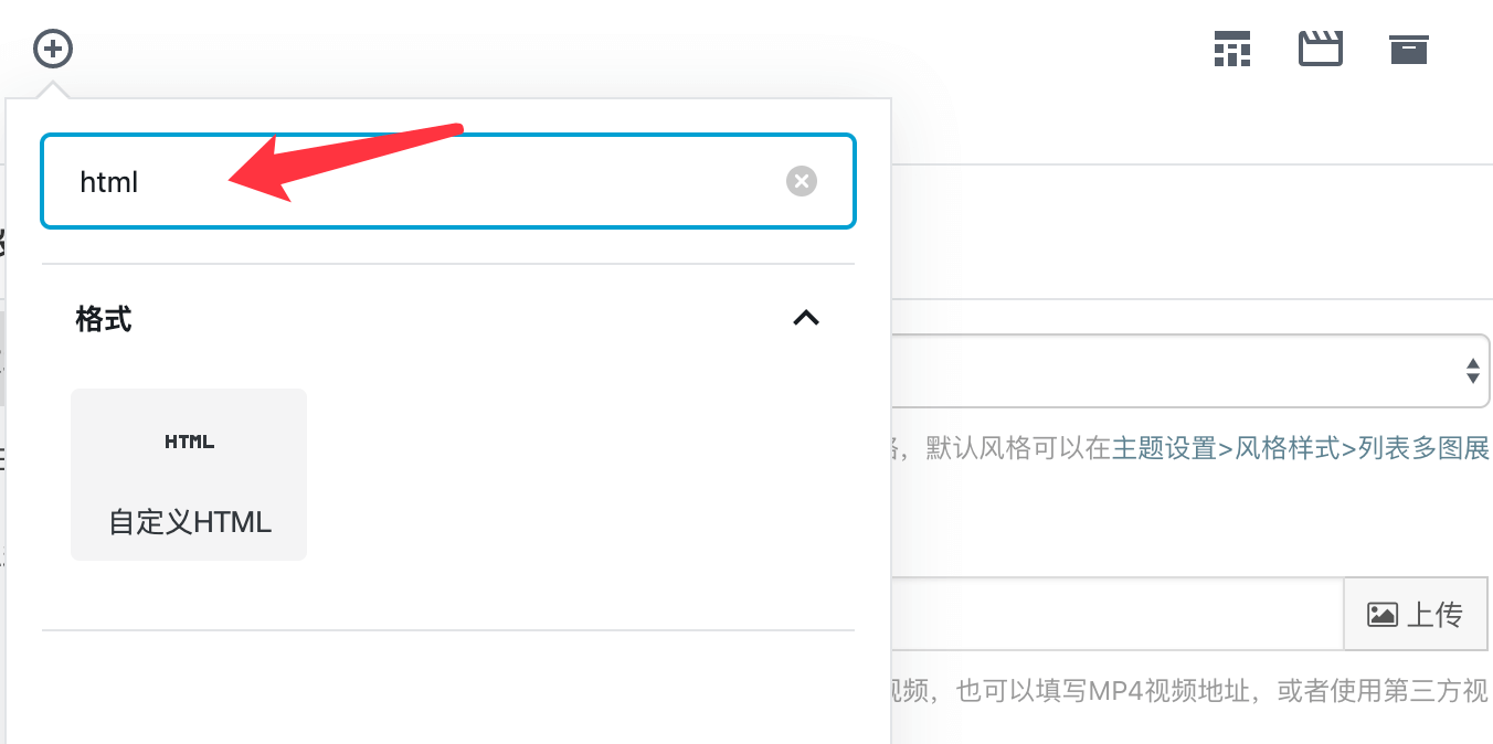 如果是第三方视频网站的视频分享代码,目前Gutenberg编辑器还没有专门正对国内视频网站优化的区块,不过可以通过自定义HTML区块添加,如图,搜索找到区块: