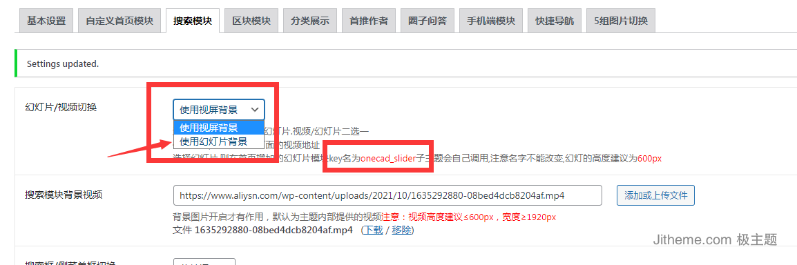 如果你想换成高清幻灯片形式展示搜索框的背景,请在子主题设置项里面设置好幻灯片,选择幻灯片,则在首页增加的幻灯片模块key名为onecad_slider子主题会自己调用,注意名字不能改变,幻灯的高度建议为600px